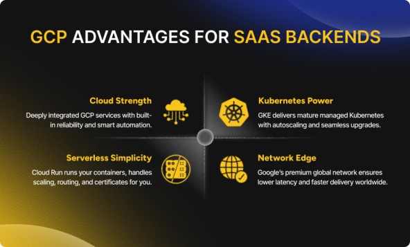 GCP offers specific advantages when building a cloud-native SaaS backend compared to other cloud providers. The integration between services runs deeper than simple API connections. When you deploy a container to GKE, load balancing, health checks, and logging are configured automatically through native integrations.