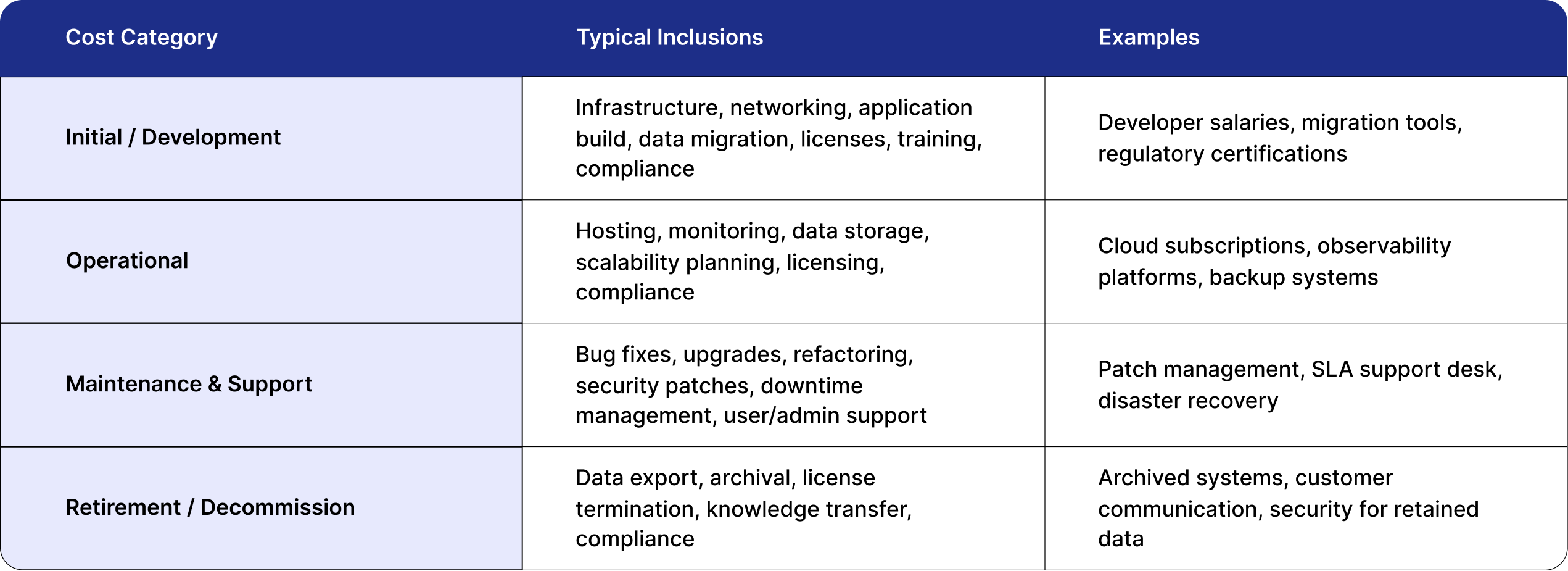 TCO represents the complete set of expenses related to a digital product over its entire lifecycle. That lifecycle begins with development and implementation, continues through operations and maintenance, and ends with retirement or decommissioning.